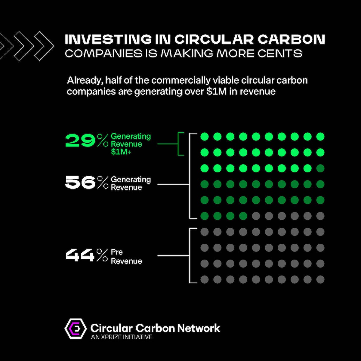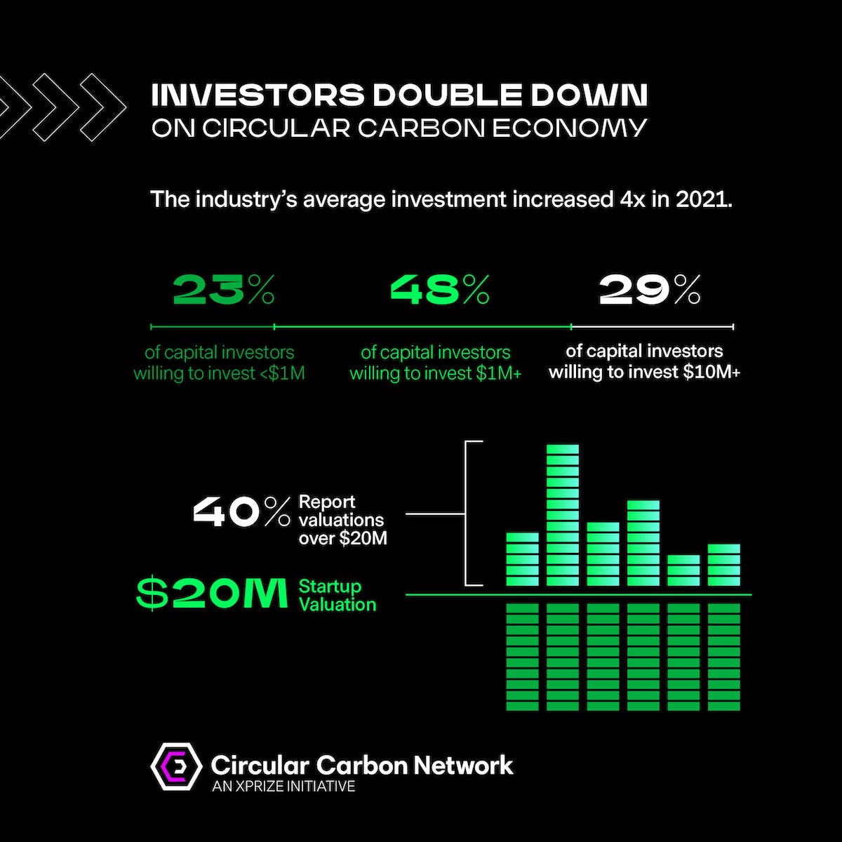 But what is the Circular Carbon Network? The Circular Carbon Network (CCN) is an XPRIZE initiative founded on the idea of building and nurturing the most important sector of the 21st century — managing our waste CO2, converting a portion of that waste into a valuable, sustainable resource for society. We noticed a severe lack of data about startups, investors, and market trends in the field, and decided to try to help fill that gap. The Circular Carbon Network provides insight into the economic history and psychology of the rapidly growing carbontech field by studying four different groups: Innovators, Investors, Corporates, and Catalysts.