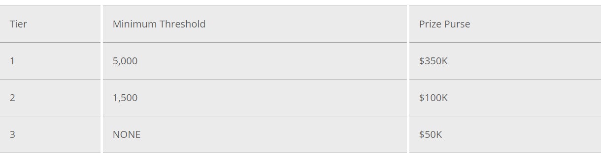 To win its tier, a team must first attain the minimum threshold of participant downloads for the tier in which it is competing. The minimum threshold for Tier 1 is 5,000 downloads. The minimum threshold for Tier 2 is 1,500 downloads. There is no minimum threshold for Tier 3.